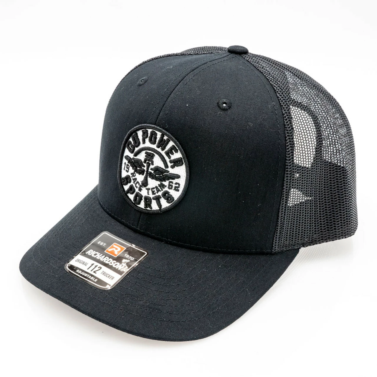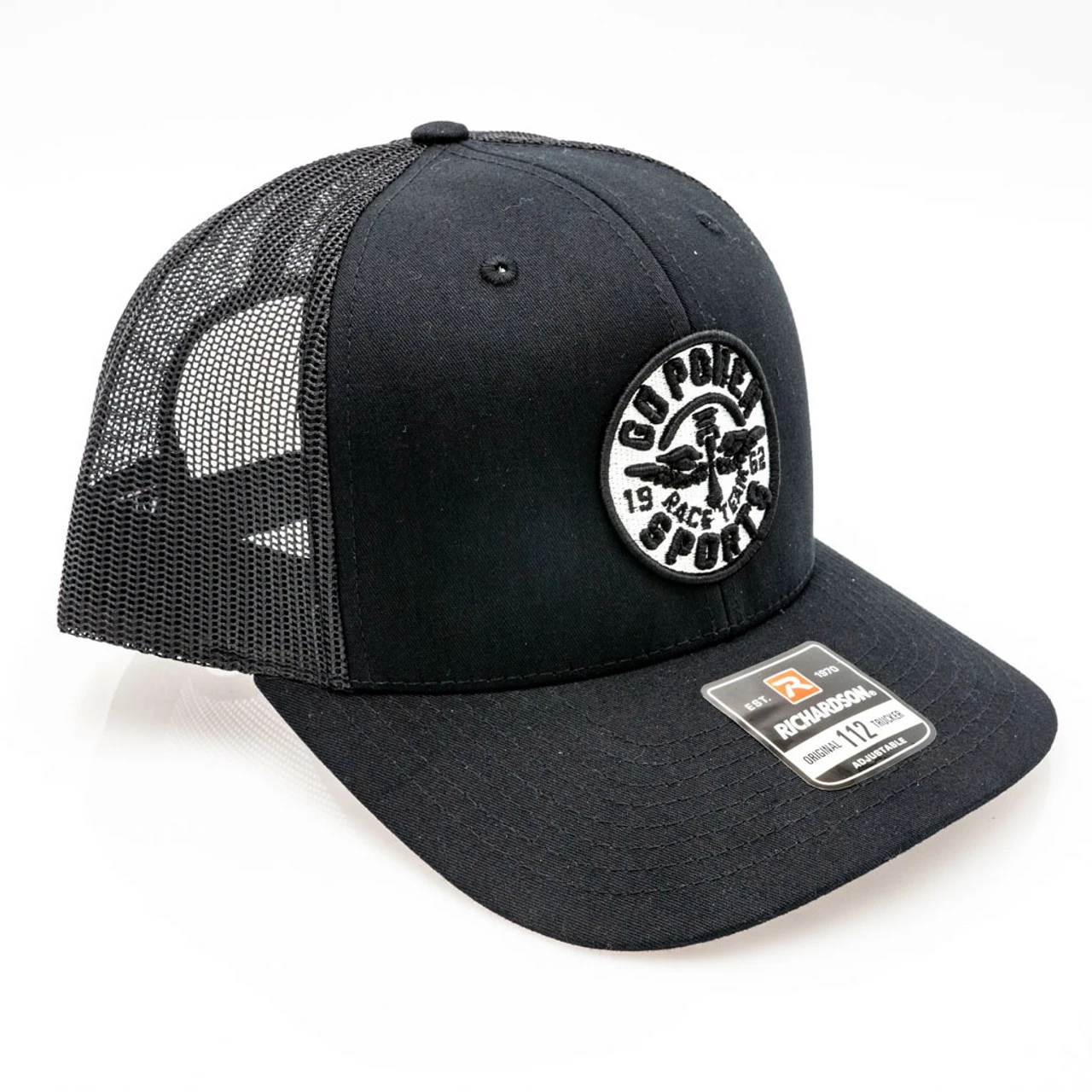 Black Richardson 112 Snapback Mesh Hat with our Race Team logo embroidered in 3D.