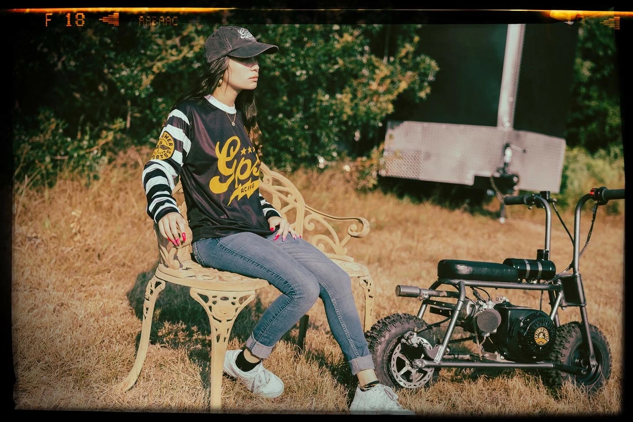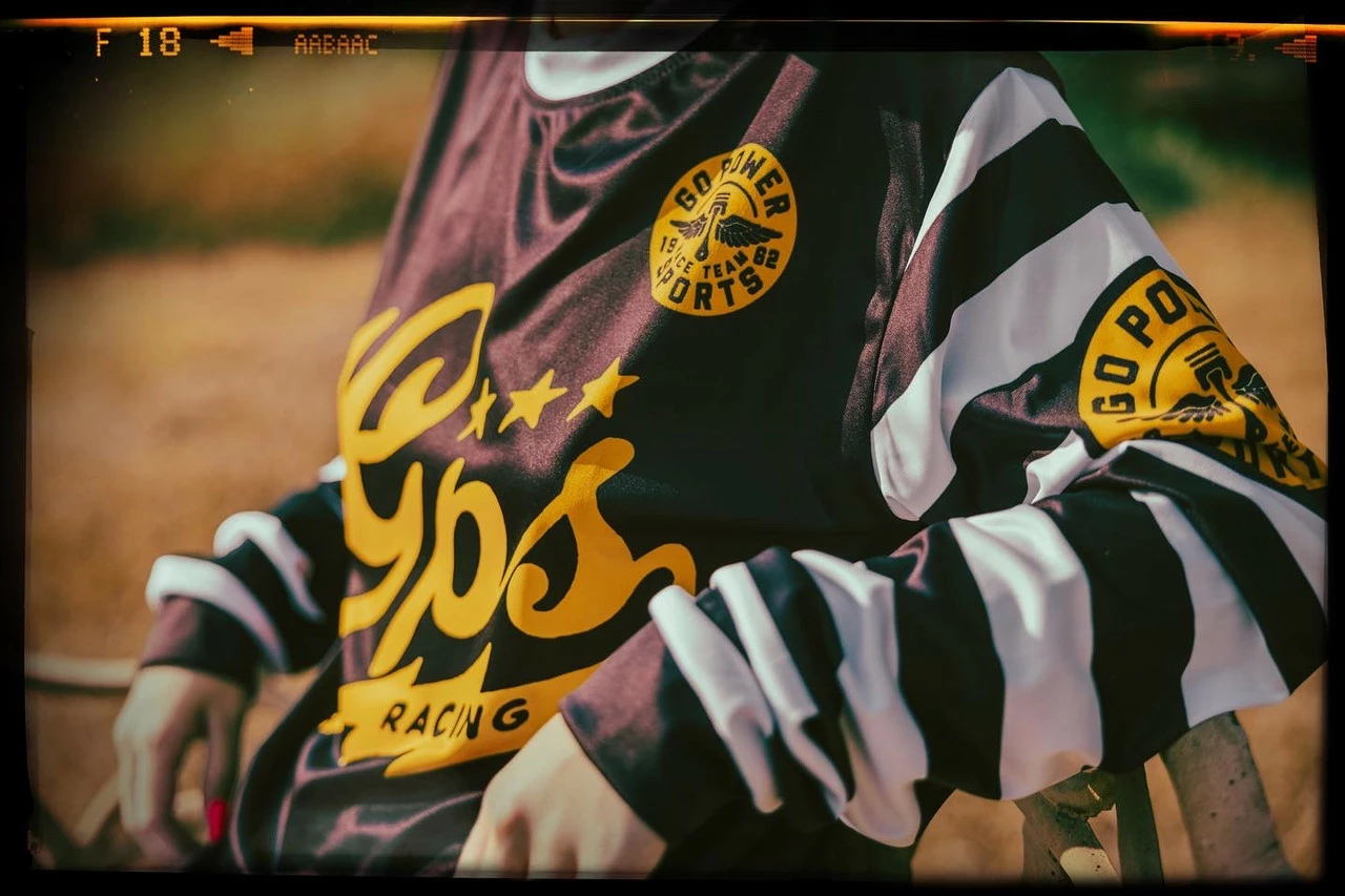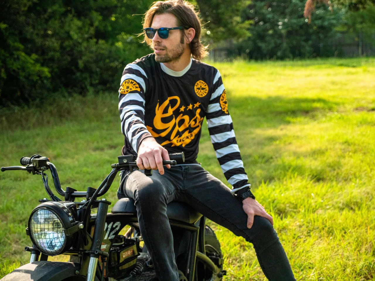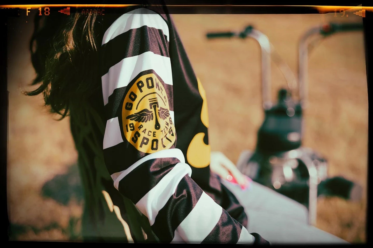 GoPowerSports Striped Race Jersey, paying homage to the good ‘ol days. Slim fitting, jersey material.