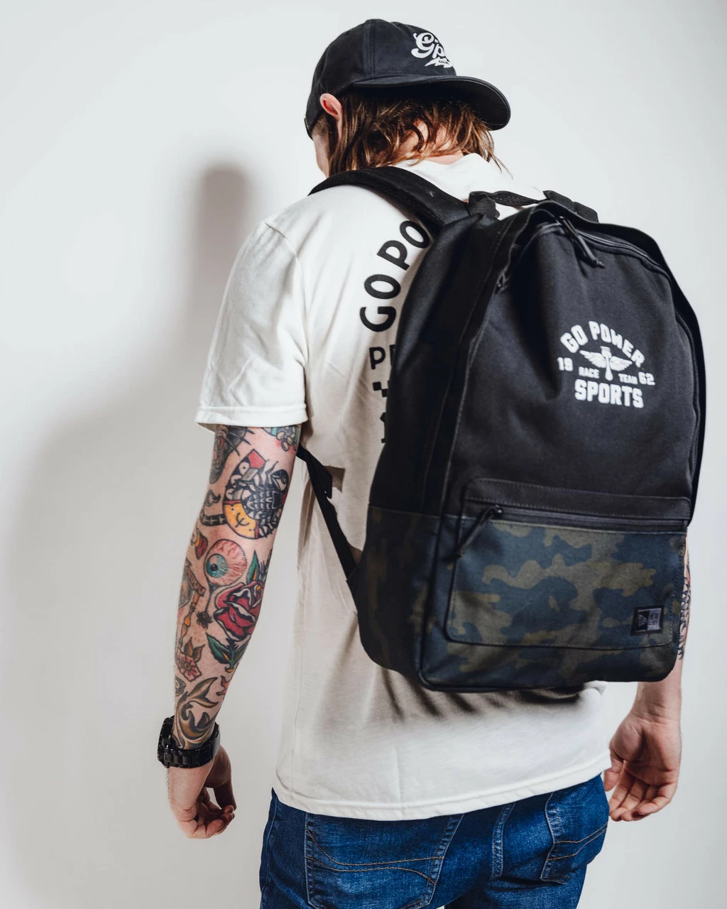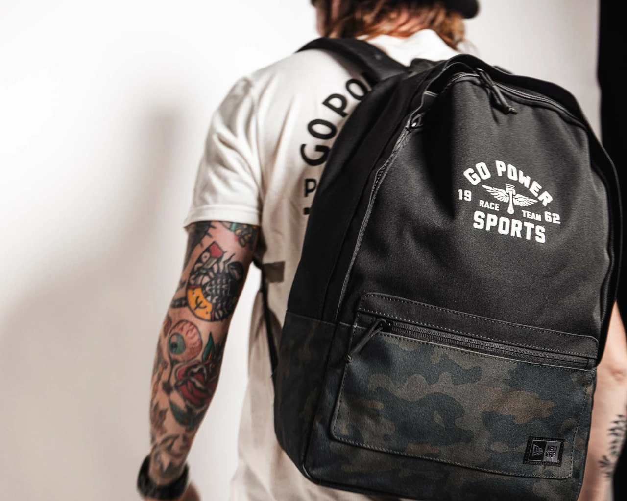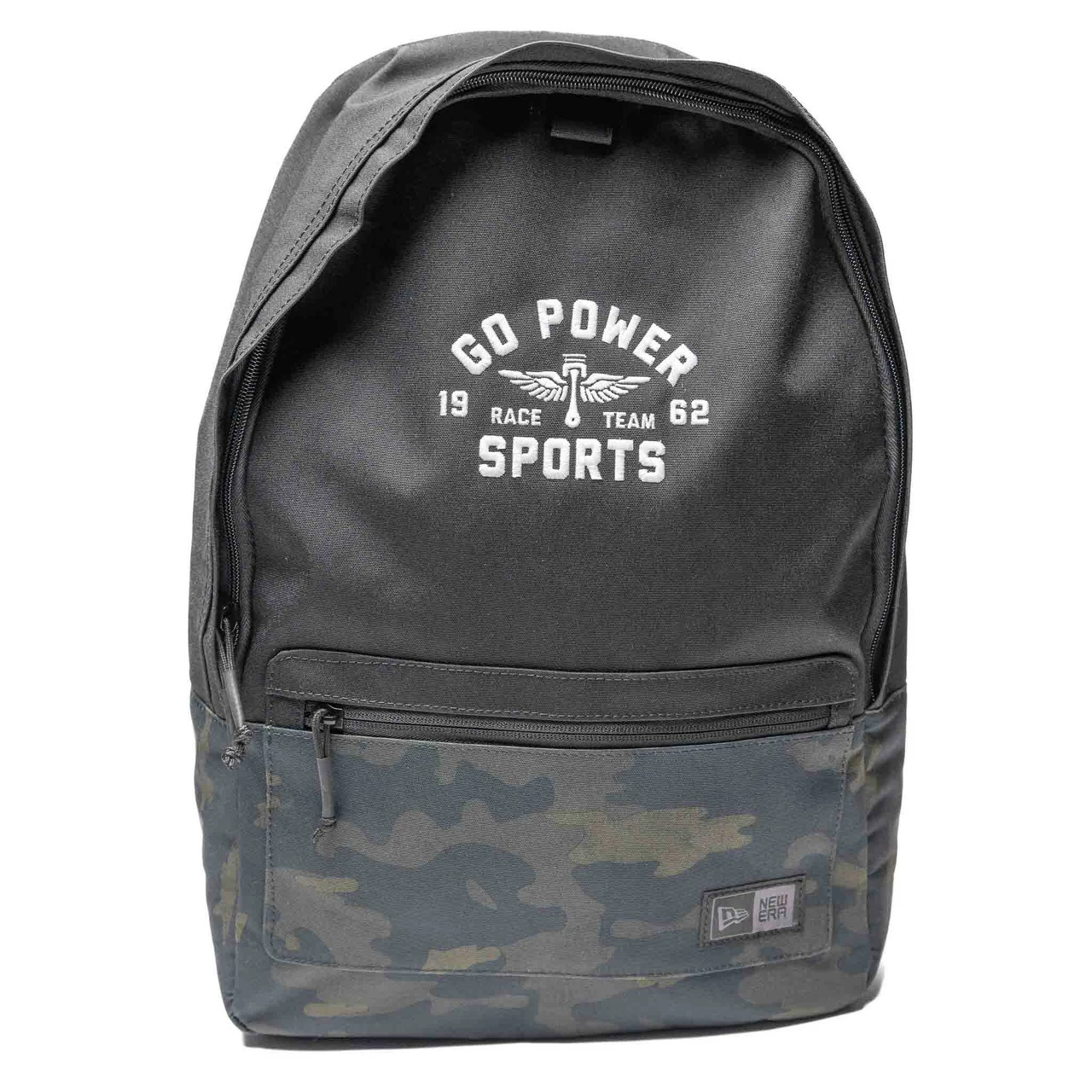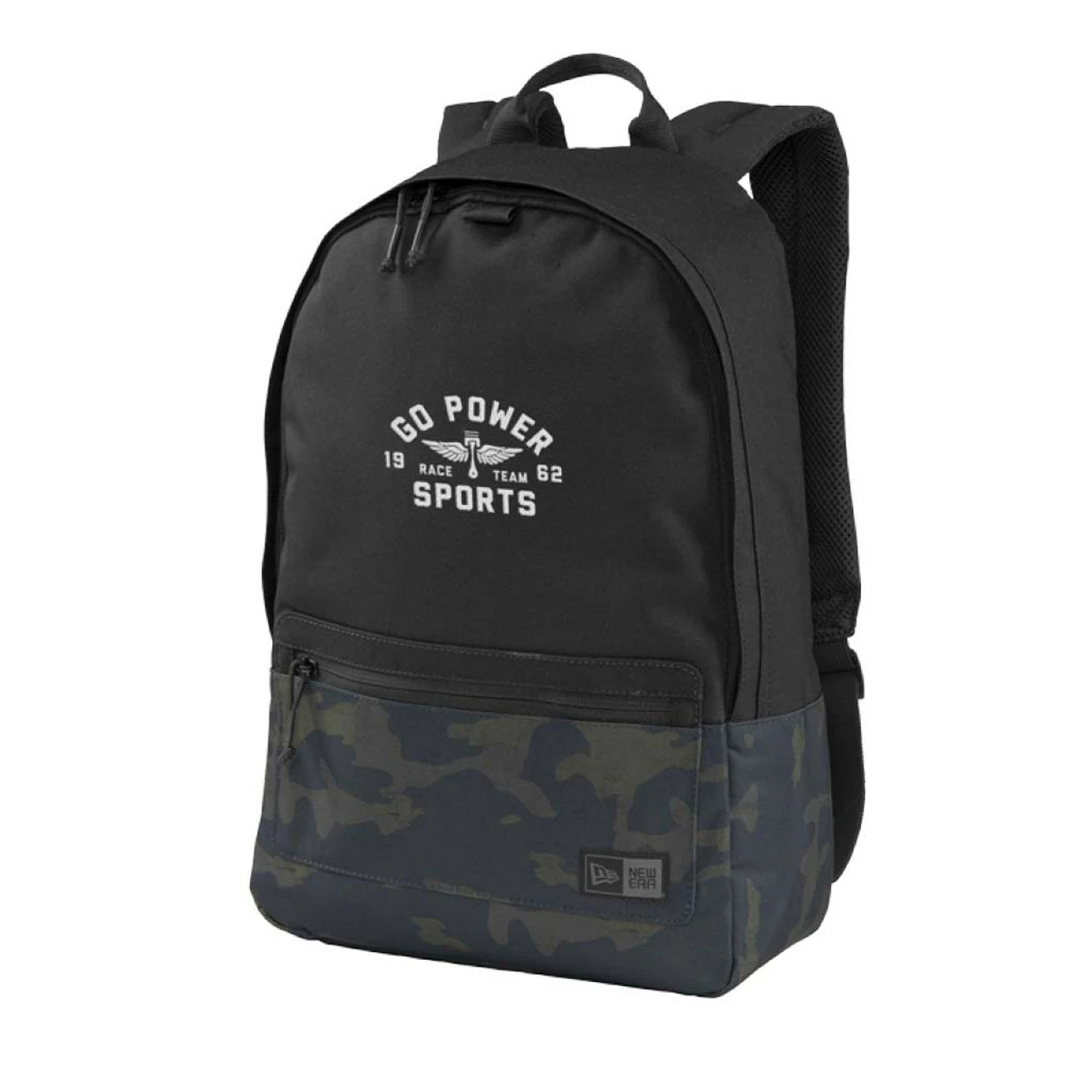GoPowerSports Race Team logo embroidered on a sweet New Era Legacy Camo backpack.