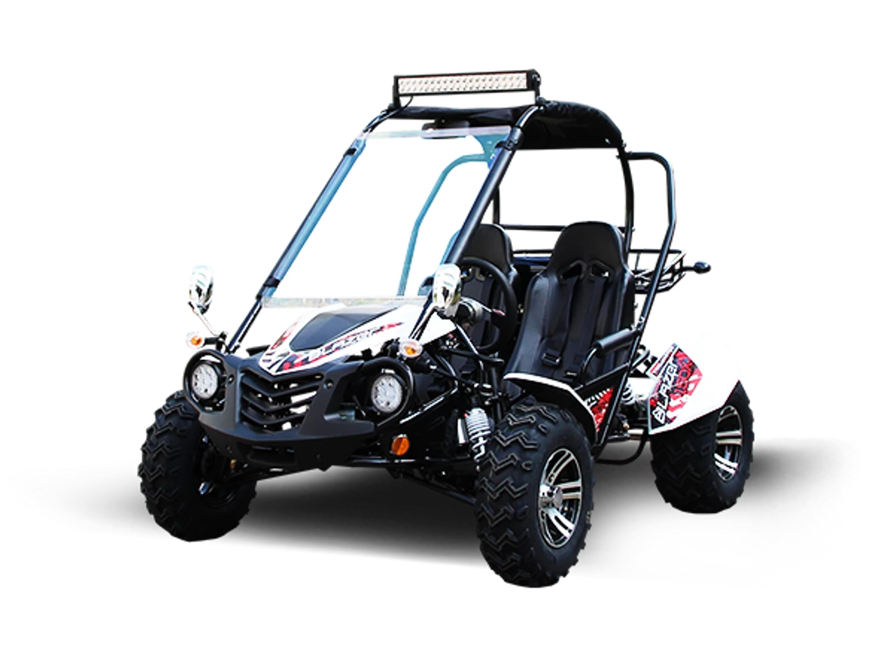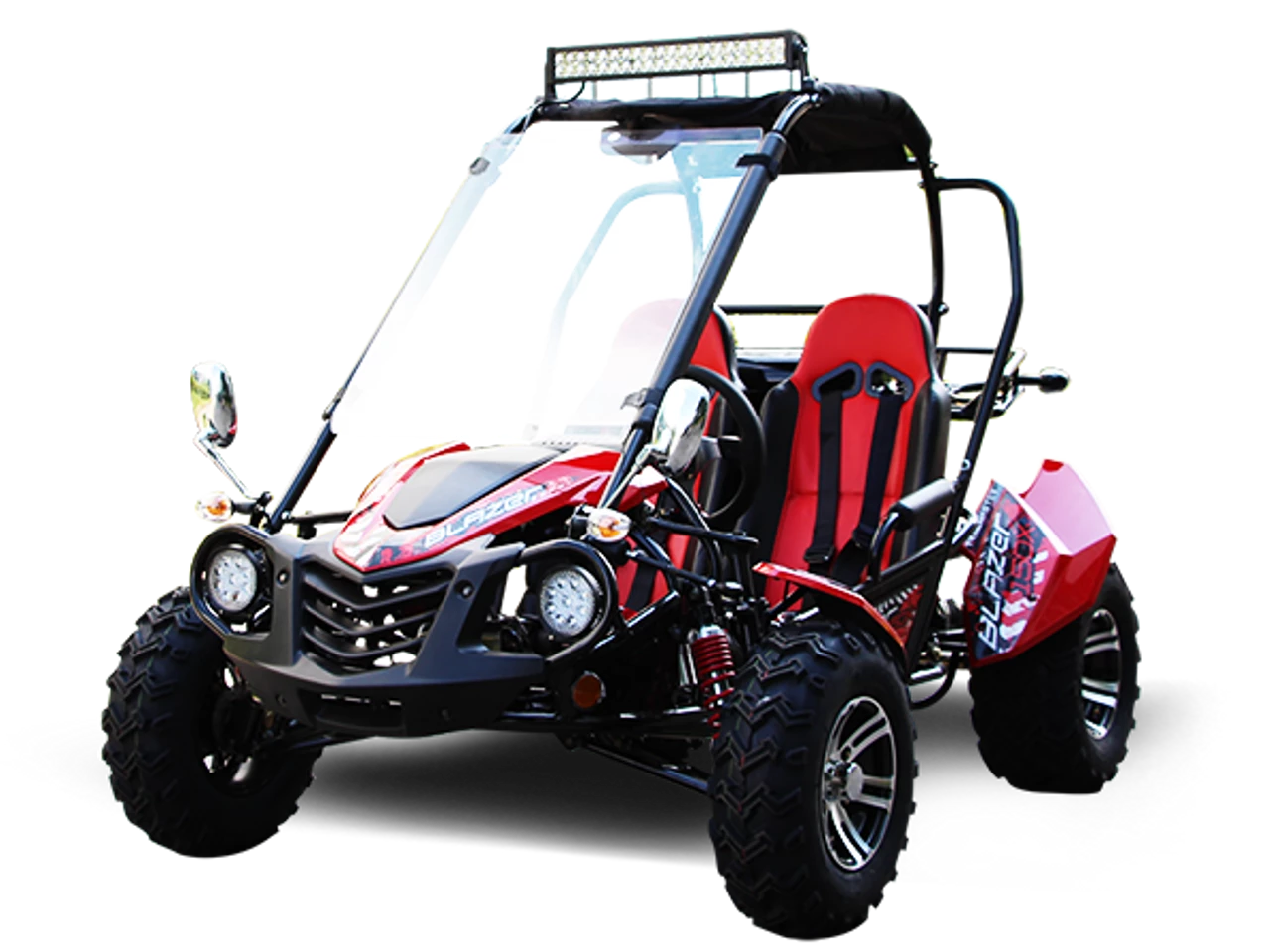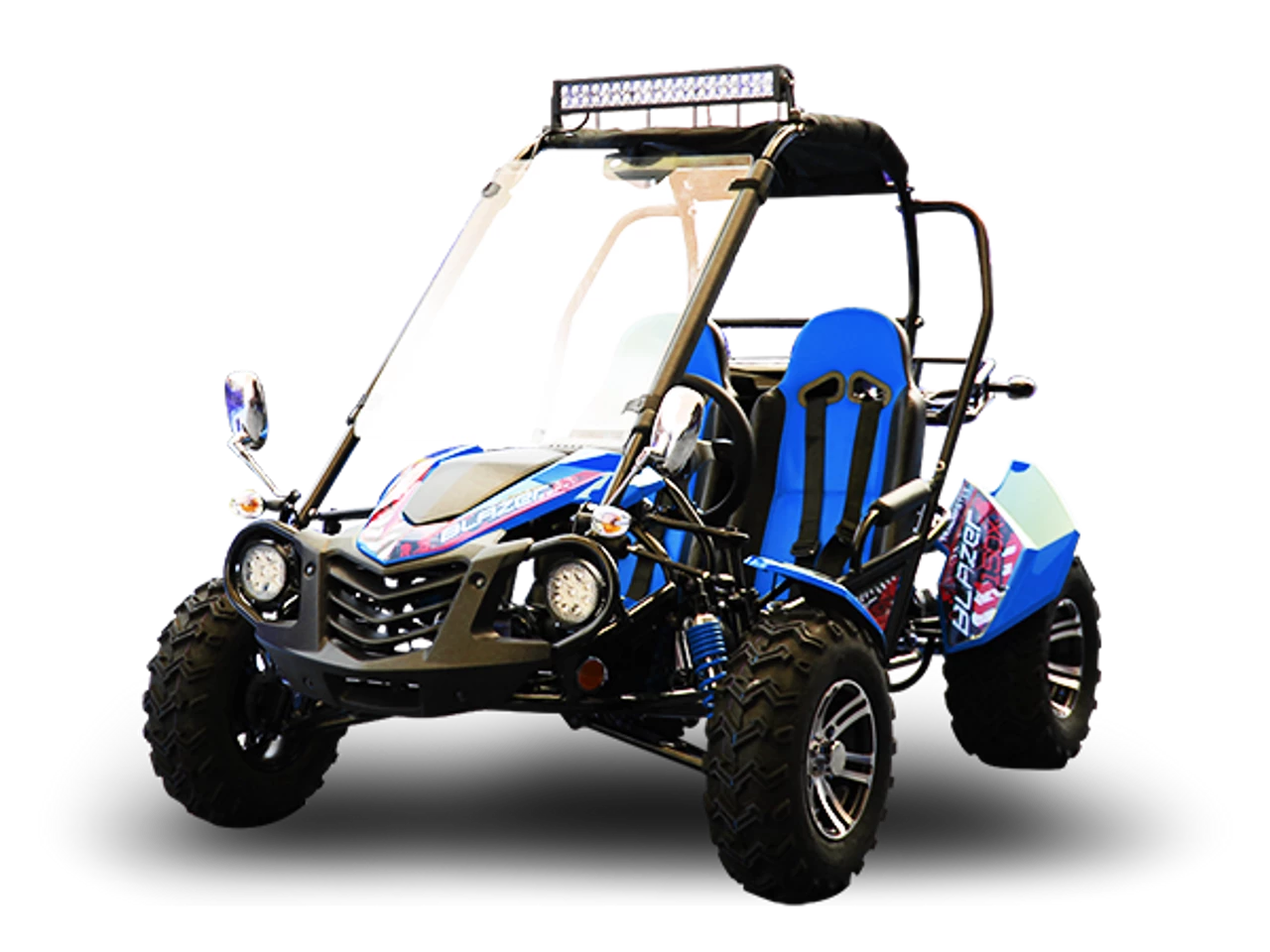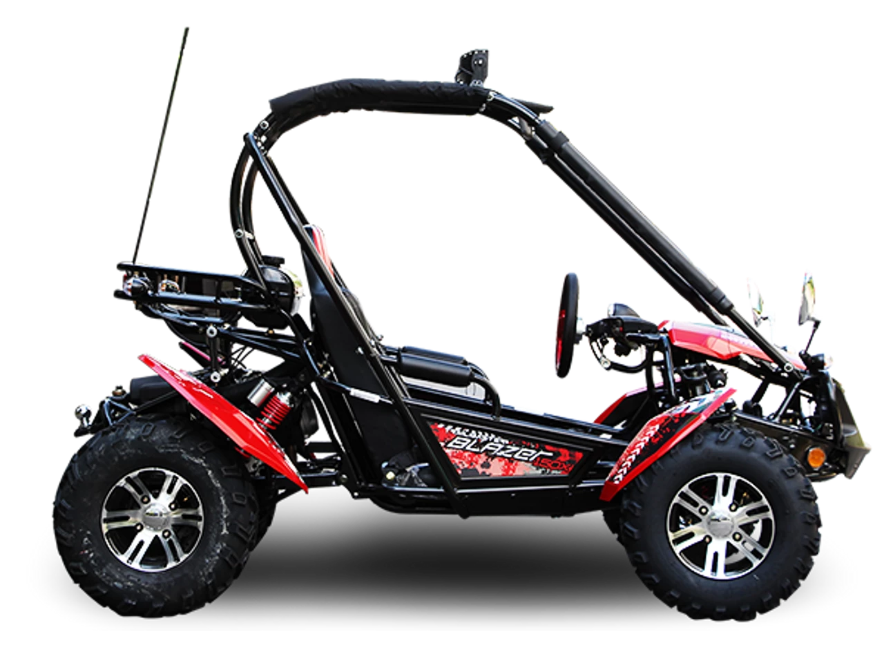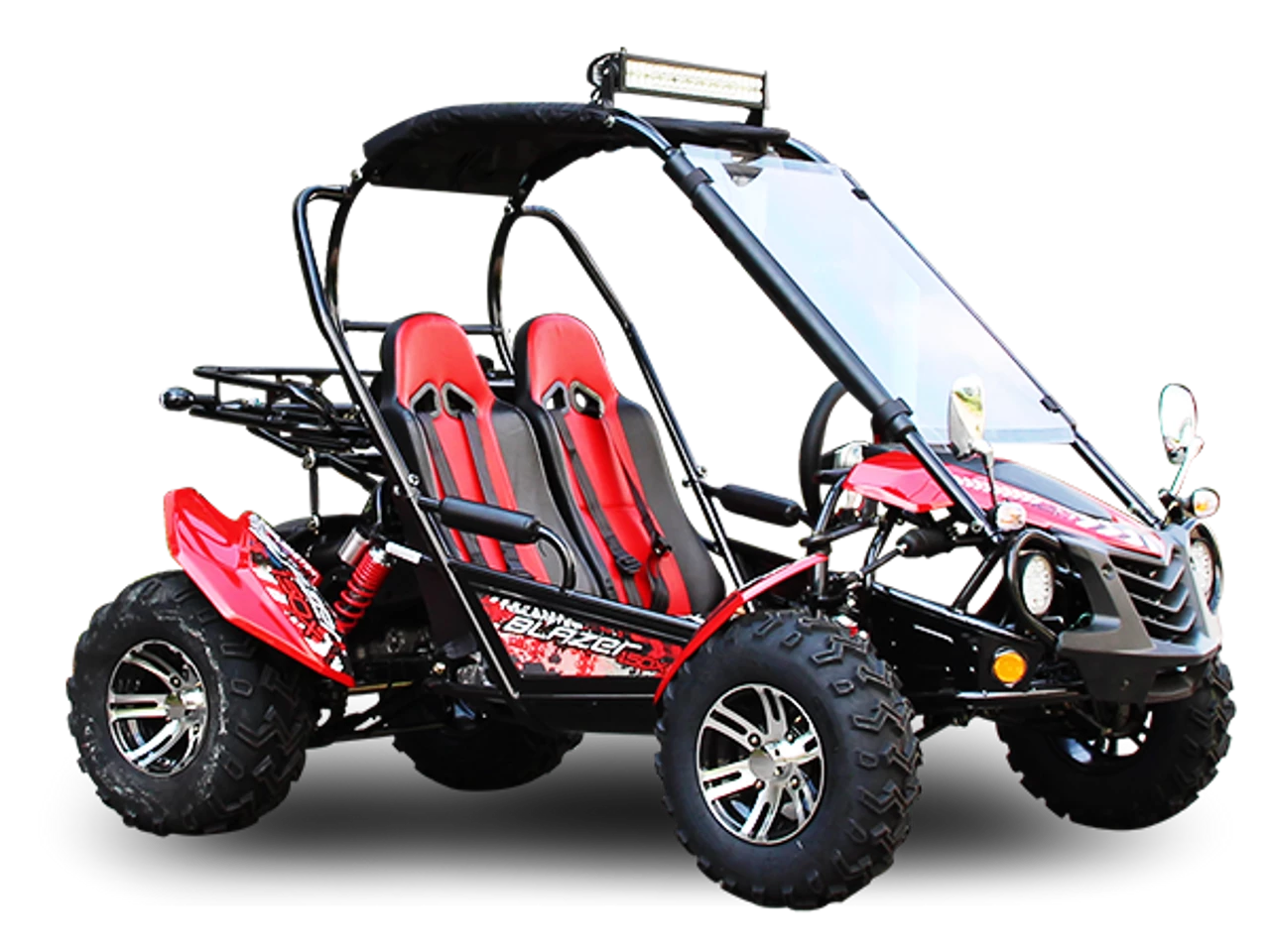 The TrailMaster Blazer 200X is the perfect family Go-Kart. This stylish go kart is made of heavy duty framing that net weighs 500 lbs and has a max capacity of 661 lbs! Power comes from a 4-stroke, single cylinder, air cooled 168.9cc, 11.1hp GY6 technology engine mated to an automatic CVT clutch for a 43 mph top speed and excellent low-end torque. There’s enough horsepower to haul light loads on the rear utility rack or to pull light-duty trailers with the included ball hitch.