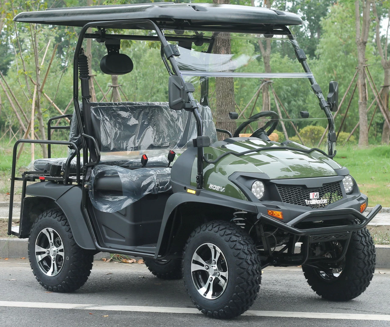 Introducing the TrailMaster Taurus 50EV fully Electric Utility Vehicle! The Taurus 50EV is a an Electric Edition of our popular Taurus utility side by side line-up. It has a 60V BLDC Brushless DC motor with 5kw of power and has a 48 mile estimated range. Other notable features includes: aluminum wheels package, large and aggressive front and rear 25 x 8-12 / 25 x 10-12 off-road tires, Hi/Lo LED headlights, turn signals, rearview side mirrors, digital dashboard, hard top, steel front bumper, retractable safety seatbelt, 12 volt outlet, and cup holders.